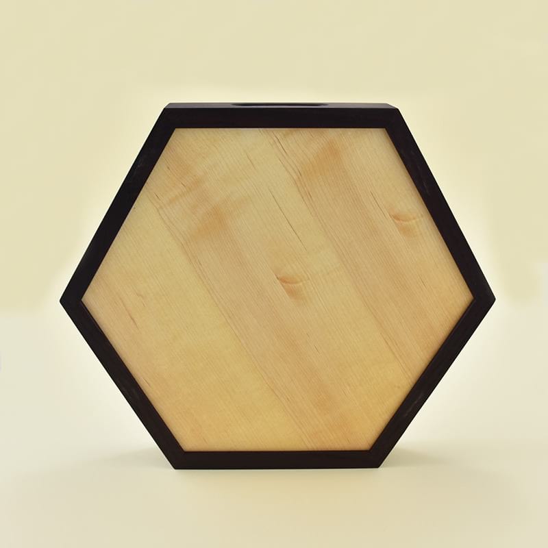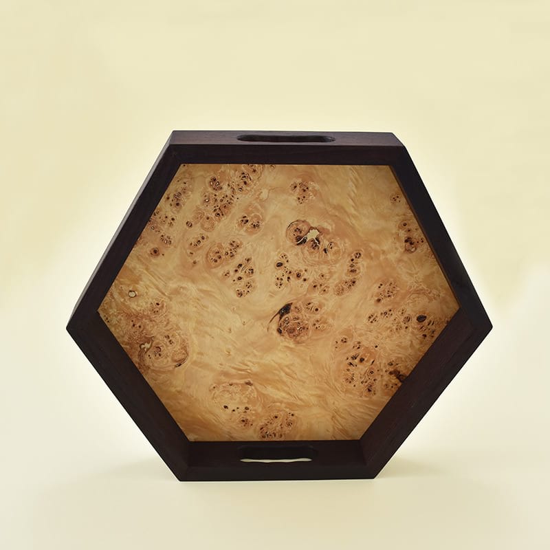 The wooden tray is made in the shape of a hexagon. The sides are made of heat-treated ash tree wood and in the middle is a veneer of poplar root. The elegant black sides are contrasting to the playful middle and together are simply perfect.